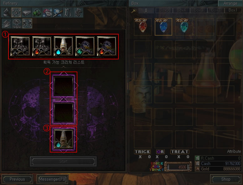 - Total 3kinds of creatures are required; 1 necessary creature and 2kinds of attribute-opened creatures.